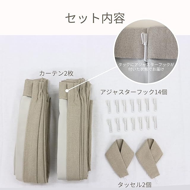【セットで届く】セット内容:カーテン2枚・タッセル2本・アジャスターフック14個(カーテンについた状態での発送となります。)