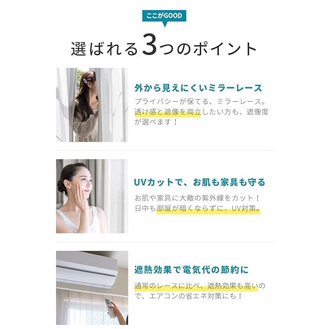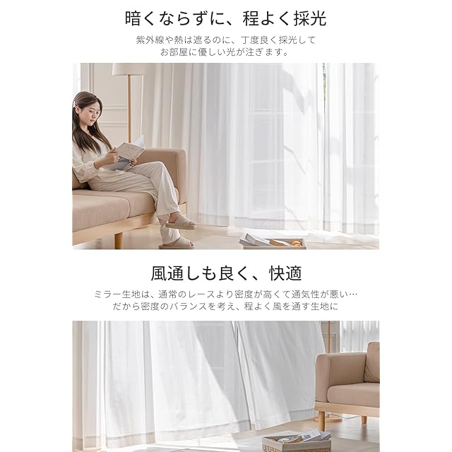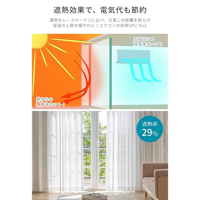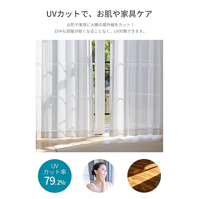 【UVカット】紫外線を吸収したり、反射したりする特殊な繊維を利用しており、可視光線は通して明るさは確保しながら、UVカットできるレースカーテンは家具やカーペットの色あせも防ぐことができます。