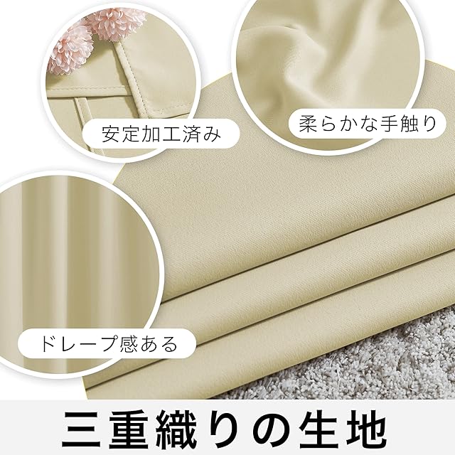 【縫製/付属品】1.5倍ヒダ・ 2ッ山 ・形態安定加工。遮光カーテン2枚入り、共布タッセル2枚付き、アジャスターフック14本付き、高さ6cmまで調節可能です。100%ポリエステルより、耐久性がよい。厚地の生地が絹のような滑らか、輝いているさま光沢があります。
