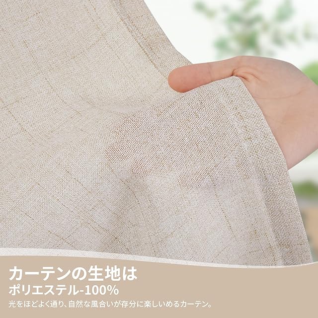 【サイズ】幅100cmx丈80cm。包装は2枚のカーテンパネルを含みます。ポリエステル100%、高品質な麻風生地で作られており、柔らかくて、風通しが良いです。軽やかな生地だけど、外から部屋の中を見えにくいです。