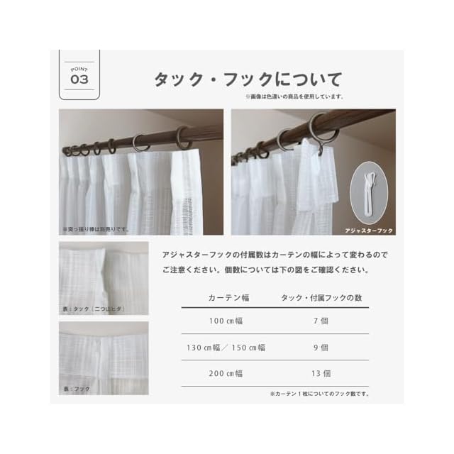 ・調節可能なアジャスターフックが付いています(洗濯の時はフックを外してください)。・縫製仕様は、1.5倍ヒダ 2つ山仕上げ。・※巾130cm、巾150cm、巾200cmは、生地に継ぎ目が入ります。
