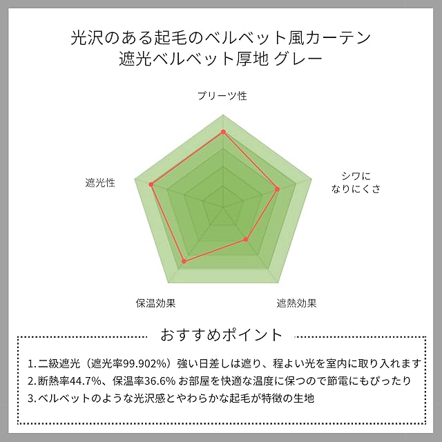 【二級遮光】密度を詰めて織り上げ、さらに起毛させることで生地の隙間を減らし、99.902%の遮光カーテンに。二級遮光なので強い日差しを遮り、程よく光を室内に取り入れ快適に。