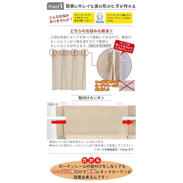 【タック縫製仕様】小窓・細窓に新提案! カーテンレール不要! つっぱり棒に通すだけでキレイに波の形のヒダが作れるナチュラルテイストのオリジナルタックカーテンです。(縫製仕様意匠登録済) コットン100%の柔らかな色味のナチュラルテイストのカーテンは人気の韓国インテリアやカフェ風インテリアにもマッチします。