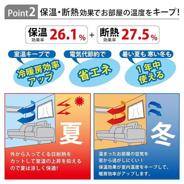 【保温・断熱効果で冷暖房効率がアップ!】夏は涼しく、冬は暖かい。お部屋の空気を逃がしにくいので保温効果が室内温度をキープして、冷暖房効率がアップします。(保温効果率 26.1% 断熱効果率 27.5%)
