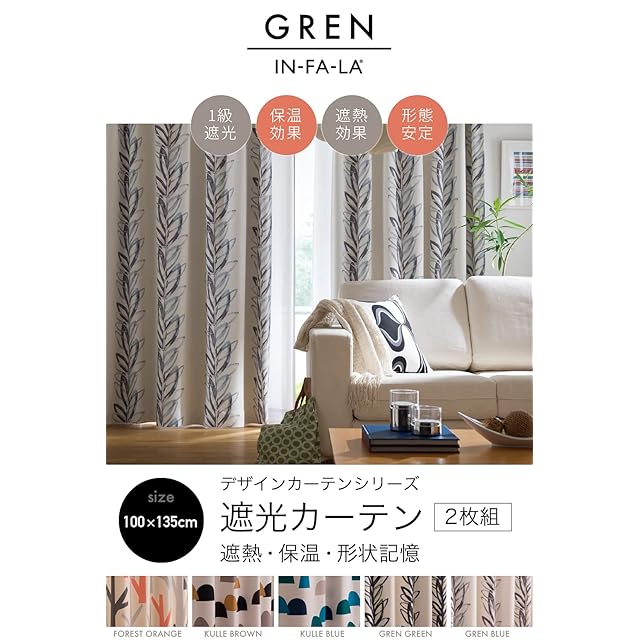 この北欧デザインの遮光カーテンは、暖房効率を向上させるために遮熱・保温機能が搭載されています。ポリエステル100%素材で、形状記憶機能があり、洗濯機洗い可能です。サイズは約100x135cm、重量は約1.3kgで、2枚組になっています。リーフ柄や花柄などの可愛らしいパターンが特徴で、リビングルームや寝室などに合わせて使えます。グロメットで吊るすことができ、ロッドポケットのトップスタイルです。
