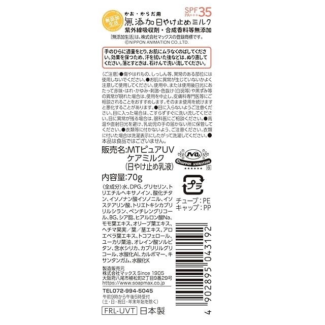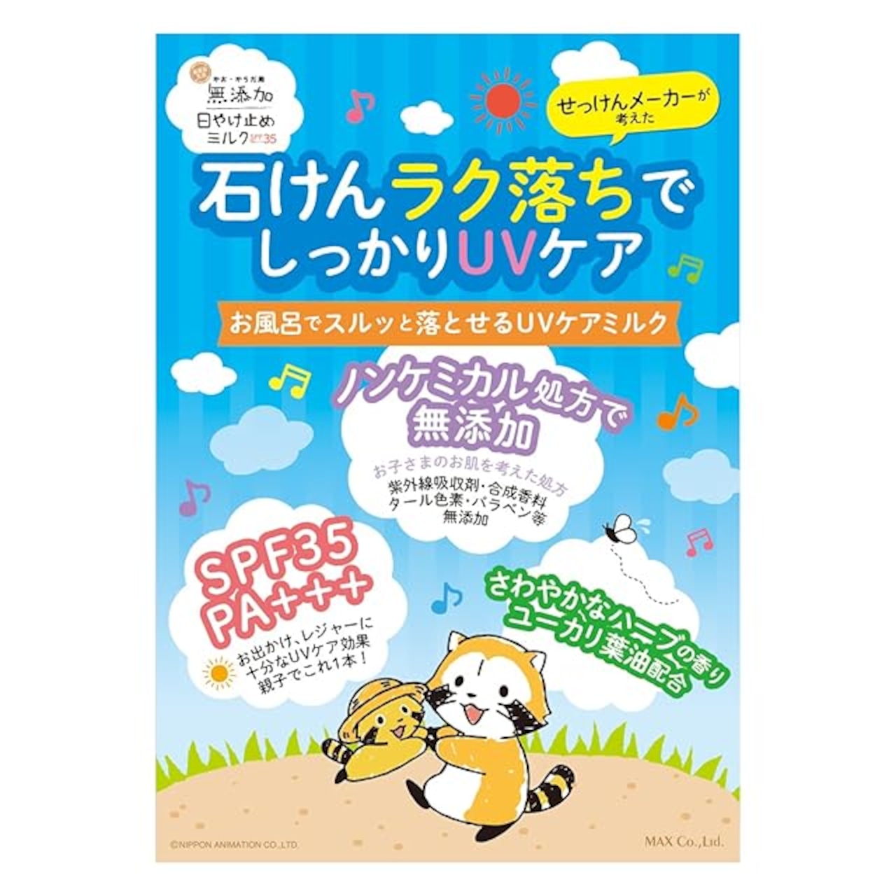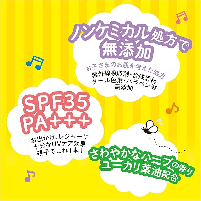 お出かけ前に親子でUVケア<br>無添加 ラク落ち処方<br><br>・無添加・低刺激・ノンケミカル<br>・紫外線吸収剤、合成香料、タール色素、パラベン、<br>・鉱物油、エタノール 無添加<br>・石けんメーカーならではの石けんラク落ち処方<br>・しっかりUVケア<br>・SPF35 PA+++<br> 普段のおでかけに十分なUVケア<br>・保湿成分配合のしっとり仕上げ<br>・虫のキライなハーブの香り<br>・爽やかなユーカリの香り