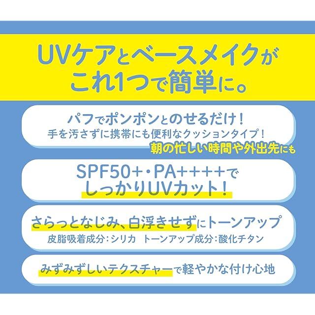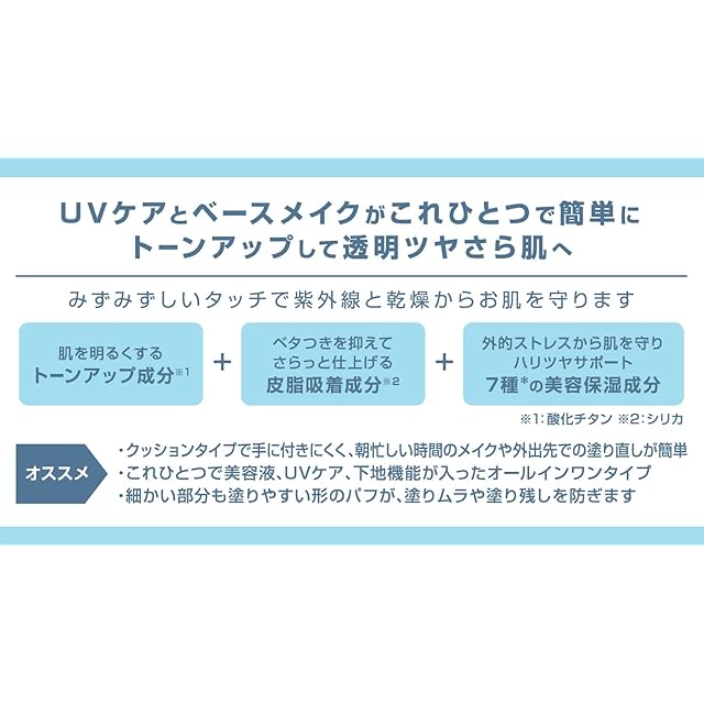 美容液、UVケア、化粧下地の1品3役の多機能クッション。肌を明るくするトーンアップ成分*1と、ベタつきを抑えて、さらっと仕上げる皮脂吸着成分*2を配合、トーンアップしてツヤさら肌へ導きます。トーンアップして肌をきれいに見せるので、メイクを頑張りたくない日のすっぴんメイクにもおすすめです。( *1酸化チタン *2シリカ)
