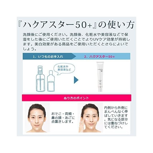 洗顔後にご使用ください。 洗顔後、化粧水や美容液などで保湿をした後にご使用いただくことでよりUVケア効果が持続します。美白効果がある商品をご使用いただくとさらによいでしょう。 【塗り方のポイント】 おでこ・両頬・鼻の頭・あごに点置きします。→内側から外側にまんべんなく伸ばしていきます。気になる部分には重ねづけしてください。