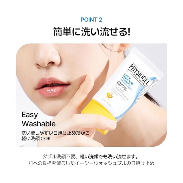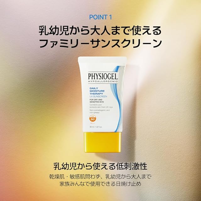 低刺激性処方の日焼け止め ・フィジオジェル独自技術の保湿効果 フィジオジェル・バイオミミック・テクノロジー(R)(Physiogel BioMimic Technology)皮膚類似成分(スクワラン)が乾燥からお肌を保護し、潤いを長く持続。同時に角質層の油・水分バランスを整えます。