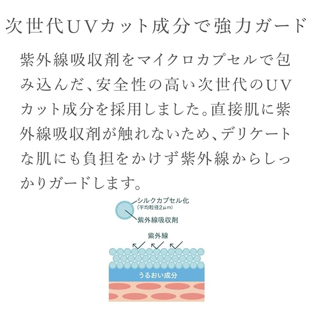 ✅【負担をかけずに、しっかり守る。次世代の紫外線カット剤】紫外線吸収剤をシルクカプセルで包み込んだ仕様のため、肌に直接触れずに、紫外線から肌をしっかりガード。さらに、クレンジングを使わずに石けんや洗顔料で簡単に落とすことができるので肌に負担をかけません。
