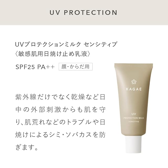 肌を守り、なめらかに整える 日焼け止め乳液。 白浮きせず、伸びがよい、敏感肌のための低刺激*な日焼け止め乳液。 紫外線だけでなく乾燥など日中の外部刺激からも肌を守り、肌荒れや日焼けによるシミ・ソバカスを防ぎます。 日常使いにちょうど良いSPF25PA++。 無香料タイプで、重ねる化粧品の邪魔をせず、塗布後はなめらかな肌に整えるので、化粧下地としてもおすすめです。 *パッチテスト*1、*スティンギングテスト済み*2 (すべての方に肌トラブル*1、刺激*2が起こらないという事ではありません。)<br><br><br> ・お肌に異常が生じていないかよく注意して使用してください。お肌に合わない次の様な場合は、ご使用をおやめください。<br>そのまま使用を続けますと症状を悪化させることがありますので皮膚科専門医等にご相談をおすすめします。 <br>① 使用中、赤み、はれ、かゆみ、刺激、色抜け(白斑等)や黒ずみ等の異常があらわれた場合 <br>② 使用したお肌に、直射日光があたって①の様な異常があらわれた場合 <br>・お肌に傷、はれもの、湿疹等のある場合は使用をおやめください。 <br>・目に入らないようご注意ください。 <br>・目に入った場合はこすらずに直ちに洗い流してください。 <br>・目に異物感が残る場合は、眼科医にご相談ください。 <br>・一度手に取ったものは容器に戻さないでください。 <br>・乳幼児の手の届かないところに保管してください。 <br>・極端に高温または低温の場所、直射日光があたる場所には保管しないでください。 <br>・材質によっては落ちにくいこともありますので衣類等につけないように十分ご注意ください。万一、衣類についた場合はすぐに洗剤でていねいに洗ってください。ご使用後はキャップをきちんとしめてください。 <br>・開封後は早めにお使いください。