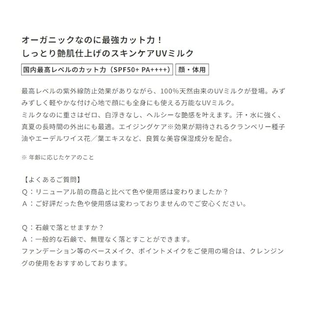 ≪ POINT2 ≫ 天然由来成分100%でUVカットを実現。:UVケアはスキンケアの一部。だからスキンケア効果のある植物由来成分とミネラル由来成分のみで国内最高レベルのUVカット力を誇るUVミルクを実現。紫外線から肌を美しく守ります。 使用している紫外線カット剤:酸化亜鉛