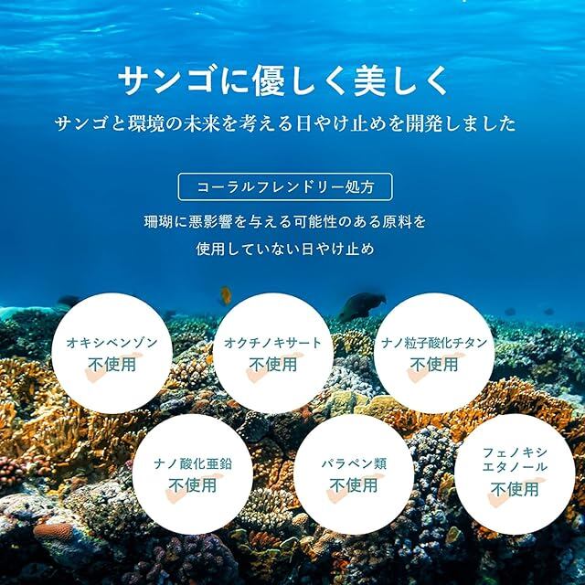サンゴに優しく、美しく<br> サンゴと環境の未来を考える日やけ止めを開発しました。<br> コーラルフレンドリー。<br> サンゴ礁が危機的状態といわれる今、私たちはこの One Planet を共生していくためサンゴに優しい成分で日やけ止めをつくることを決意しました。 サンゴ保全で先進的な取り組みを行っているパラオ共和国やハワイの基準もクリア、尚且つ白浮きしなく化粧下地にもなる美容成分入り化粧品です。<br> <br> ・SPF43 PA+++でしっかりガード。<br> ・化粧下地としても使えるロングラスティング処方。<br> ・汗や皮脂に強く、落ちにくい<br> ・肌に優しいスキンケア成分配合。<br> 美容保湿成分配合<br> 【エモリエント成分】スクワラン(植物性)・ホホバ 種子油・コメ 胚芽油<br> 【保湿成分】ヒアルロン酸Na
