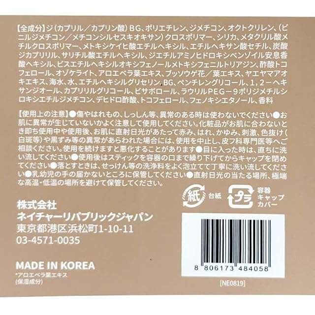 スティックを容器から5mmほど繰り出し、肌に直接フィットさせ、塗りムラのないように塗布してください。 目の際や鼻の周辺などスティックがフィットしにくい部分は、指でスティックをなでるようにして取りなじませてください。 効果的にご使用いただくために、こまめに塗り直し、汗をかいた肌は汗をふき取ってからご使用ください。 【使用上の注意】 ●傷やはれもの、しっしん等、異常のある時は使わないでください ●お肌に異常が生じていないかよく注意して使用してください。化粧品がお肌に合わないとき即ち使用中や使用後お肌に直射日光にあたって赤み、はれ、かゆみ、刺激、色抜け(白斑等)や黒ずみ等の異常があらわれた場合には、使用を中止し、皮フ科専門医等へご相談ください。使用を続けますと悪化することがあります ●目に入った時は、直ちに洗い流してください ●使用後はスティックを容器の口まで繰り下げてからキャップを閉めてください ●落とすときは、せっけん等の洗浄料をよく泡立てて丁寧に洗い流してください ●乳幼児の手の届かないところに保管してください ●直射日光の当たる場所、極端な高温・低温の場所を避けて保管してください
