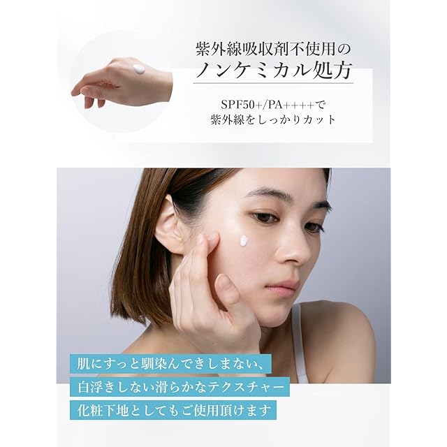 【国内最高数値の「SPF50+/PA++++」の日焼け止め】</br> 紫外線吸収剤不使用のノンケミカル処方で肌に優しく、敏感肌の方でも安心してご使用いただけます。 </br> 国内最高数値の「SPF50+/PA++++」なのに、肌にすっとなじんできしまない。</br> 白く残らないストレスフリーでなめらかな使用感。 化粧下地としても使用できます。</br> </br> 【ご使用方法】</br> スキンケアで整えた肌にご使用ください。</br> 適量を肌にムラなくなじませてください。</br> タオルなどで拭いた後は、つけ直してください。 </br> </br> 【適量】</br> パール粒2個分(約0.8g) </br> </br> 【フリー成分】</br> 紫外線吸収剤フリー・無香料・無着色・無鉱物油・エタノールフリー・パラベンフリー・動物性原料フリー</br>