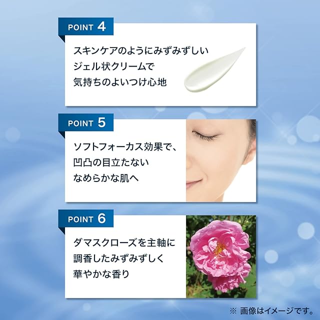 【白浮きなし】白うきのないみずみずしく美しいハリつや肌に仕上げます。【ソフトフォーカス効果】凹凸の目立たないなめらかな肌を演出。