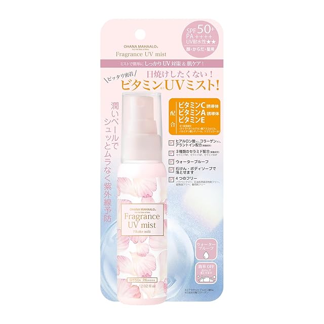 日焼けしたくない!ダメージ肌にビタミンUVミスト。 ミストで簡単!シュッとするだけのUVミスト。 3種のビタミンを配合した潤いベールでシュッと紫外線予防。 日焼けしたくないダメージ肌に ヒアルロン酸、コラーゲン、アラントイン配合 3種のセラミド配合:(保湿成分):セラミドNP、セラミドAP、セラミドEOP 4つのフリー:パラベンフリー、石油系界面活性剤フリー、鉱物油フリー、着色剤フリー