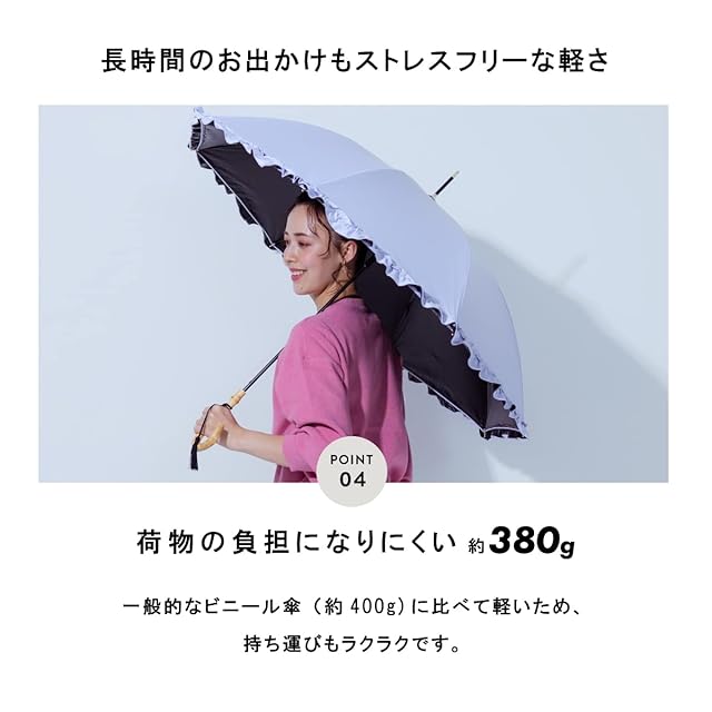 【毎日使える晴雨兼用】 この製品は、紫外線遮蔽・遮光・遮熱効果を目的とした日傘です。また、生地にはPUコーティングを施しているため防水効果が見込め、雨の日にもご使用いただけます。