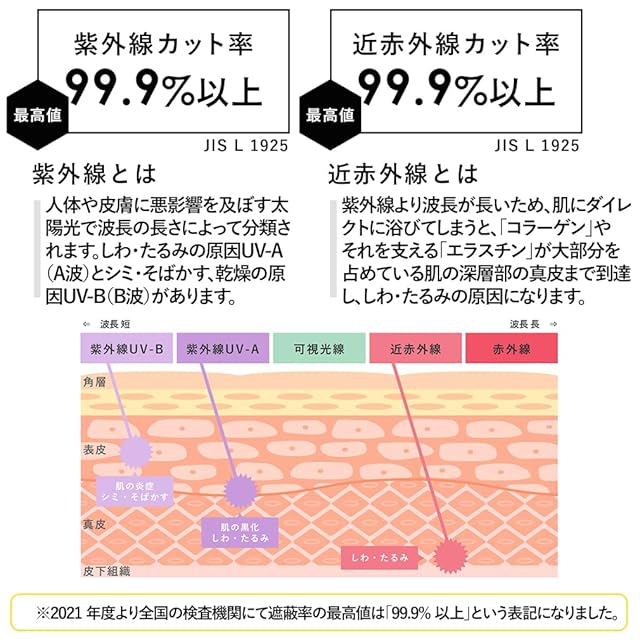 《日傘として》 ポリエステル生地の裏面をPUコーティングしているので 『遮光率・紫外線カット率』ともに最高値。 また、肌の深層部まで到達すると言われる『近赤外線』も99.9%以上カット! 夏の強い日差しを遮ります。 また、遮熱効果も高く日傘を差すだけで約-17℃と太陽の熱線も和らげます。 生地の裏側をブラックコーティングにすることで、地面や壁からの照り返しを 「黒」が吸収し、お顔周りの日焼けを防いでくれます。 《雨傘として》 雨の日も晴れの日も使える「晴雨兼用傘」。 撥水加工を施しているので、最高級の撥水力『5級撥水』で 急な雨もしっかり弾いてくれます。 ※本製品は晴雨兼用傘ですが、日傘としての使用を主しております。 激しい雨風の際は、破損の恐れがありますのでご注意ください。