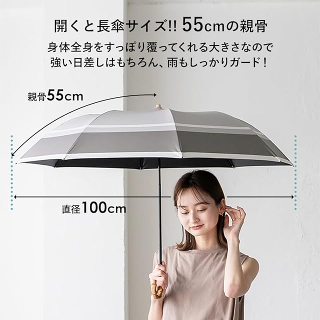 ■サイズ等 【開いた時】 ●直径:約100cm ●全長:約68cm ●親骨の長さ:約55cm ●傘骨:8本 ●石突:木(約1.5cm×約1cm) ●露先:ABS樹脂 ●手元:竹 ●生地:完全遮光生地(ポリエステル100%裏面PUコーティング) ●親骨:グラスファイバー+アルミ ●中棒:アルミ ●仕様:晴雨兼用傘 ●ネームベルト:ホックボタン ●重さ:約270~300g(竹手元のサイズによって変動) 【収納時】 ●横:約7.5cm ●縦:約42cm ●ボタン:ホックボタン