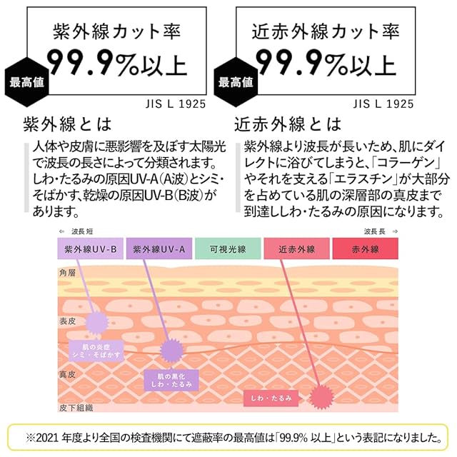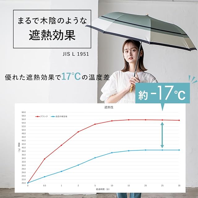 《日傘として》 ポリエステル生地の裏面をPUコーティングしているので 『遮光率・紫外線カット率』ともに最高値。 また、肌の深層部まで到達すると言われる『近赤外線』も99.9%以上カット! 夏の強い日差しを遮ります。 また、遮熱効果も高く日傘を差すだけで約-17℃と太陽の熱線も和らげます。 生地の裏側をブラックコーティングにすることで、地面や壁からの照り返しを 「黒」が吸収し、お顔周りの日焼けを防いでくれます。 《雨傘として》 雨の日も晴れの日も使える「晴雨兼用傘」。 撥水加工を施しているので、最高級の撥水力『5級撥水』で 急な雨もしっかり弾いてくれます。 ※本製品は晴雨兼用傘ですが、日傘としての使用を主しております。 激しい雨風の際は、破損の恐れがありますのでご注意ください。