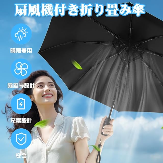 【ファン付き折り畳み傘】日傘の中に扇風機がついたファンファンパラソル。傘を開きスイッチボタンを押すとファンが勢いよく回り風が起こります