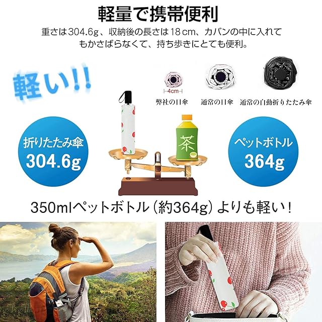 ☂【超軽量日傘&携帯便利】折りたたみ傘はガラス繊維と航空アルミ合金傘骨を採用するので、傘本体の重さは304.6gの軽量化に実現しました。普通の折り畳み傘の半分の重さしかないです、カバンに入れて常備しても負担になりません。持っていることを忘れるくらい、軽くて持ち運び便利!ショッピング途中や旅行をする時に有効な保護を提供します。傘カバーも付いていますので、濡れた傘の収納にも困りません。
