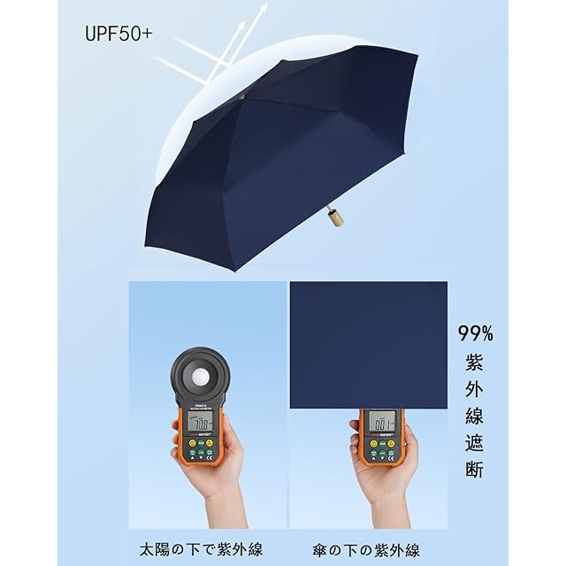 【UVカット*完全遮光遮熱】 UVカットの力強い味方 。 しっかりUVケア 紫外線遮蔽率99%以上、遮光率100%、UPF50+の折りたたみ傘です。真夏の強い日差しを遮り、大切なお肌を太陽光線、紫外線からガードでき、日焼け対策アイテムとして猛暑を乗り切ります、UVカット率は99.9%以上。特に夏には、日差しは強くなくても紫外線は強いので、ぜひこの傘をお使い、綺麗なお肌を紫外線から守りましょう。