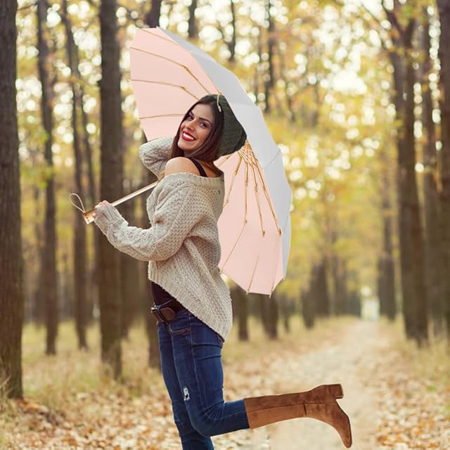 Dlin日傘 レディース 折りたたみ傘 UPF50+ レディース傘 大きめ 遮光 折り畳み傘 16本骨 手動開閉 持ちて木 超撥水 ゴールド傘骨 (ピンク)