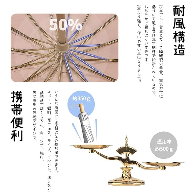 【ゴールド16本骨防風 頑丈傘】柔軟性と強度を併せ、耐風性と耐久性ともに向上させた折り畳み傘です。通常の日傘より、16本の傘骨まで増やし、空気力学に基づいて風を受け流す構造で設計されているので、風速10m/sまで耐えられます。傘骨がアルミやスチール製のものより軽くなるグラスファイバー製ので、普通の16本骨より軽くなります。また、コーティングは金メッキされているので錆びることは心配がありません。
