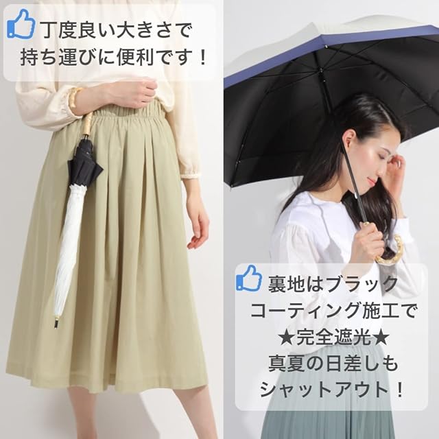 日傘 長傘 完全遮光 軽量 UVカット 傘 レディース 撥水 晴雨兼用 バンブー 持ち手 おしゃれ かわいい 耐風 風に強い 遮光率100% 率99.9%以上 UPF50+ 【OK basket】 (ホワイト&ネイビー) | ascend