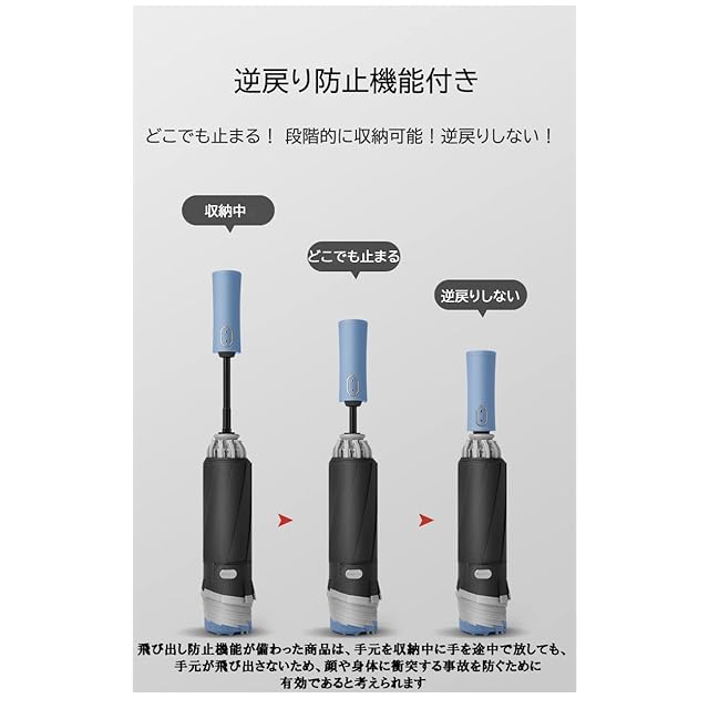 【逆戻り防止機能】折りたたみ傘はどこでも止まる! 段階的に収納可能!逆戻りしない!飛び出し防止機能が備わった商品は、手元を収納中に手を途中で放しても、手元が飛び出さないため、顔や身体に衝突する事故を防ぐために有効であると考えられます。
