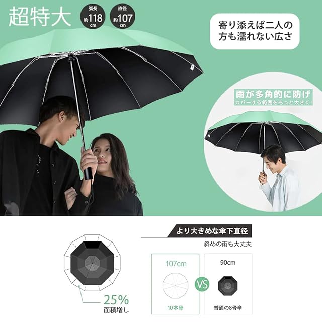 【超撥水性&特大雨傘】開口径107cm、マルチアングル防雨、大傘カバー!大人2人で窮屈さを感じることなく快適に使用できます。体や荷物を濡らさずに外出できる特大傘。また、傘の表面は厚みを増した多層設計を採用しているため、高密度の生地に比べて雨水に濡れにくいです。