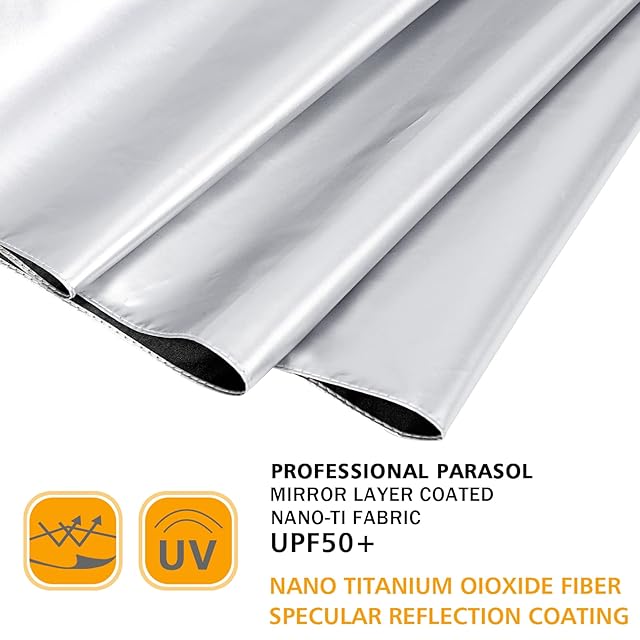 UPF 50+ 日傘: シルバー コーティング層の生地が熱を反射して体を冷やします。 UPF 50+ の高い UV 定格は、有害な UVA および UVB 太陽光線の 99.9% をブロックし、太陽の下で肌を保護します。 太陽の下で涼しく、雨の中でも安全に保ちます。