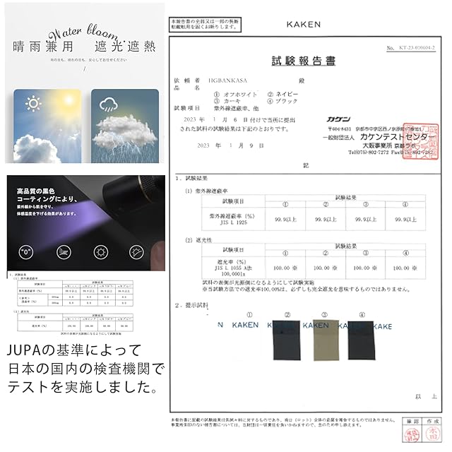 日傘の効能です。生地の裏面にUVコーティングとブラックこーティンをしております。カバーのUVカット率99.9%以上、遮光率は99.99%以上で一級遮光です。遮光、遮熱なので暑い日の外出はお熱症の心配がありませんです。