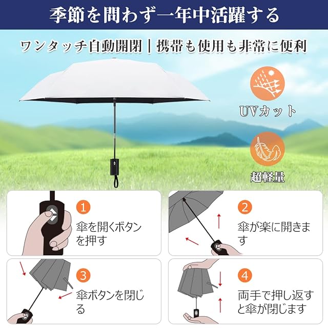 ☂【ワンタッチ自動開閉傘】片手で楽々開閉できるおりたたみ傘!ワンプッシュで元通り!!強風などで傘が反り返っても、ボタンをプッシュするだけで元の姿に。車やバスなどの乗り降りの際や、荷物で片手が塞がっているときに非常に便利です。ご注意:この傘は軽いデザインなので、ボタンが小さく、ボタンの中を押しても開閉できます。