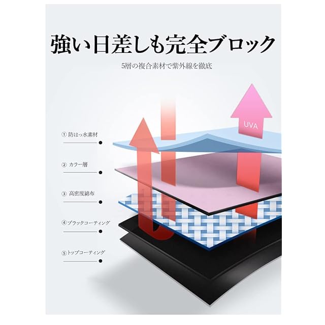 強い日差しも完全ブロック、5層の複合素材で紫外線を徹底。紫外線をブロックするだけでなく、高い遮熱率でまるで日陰にいるような涼しさ、暑さや日差しからあなたを守ります
