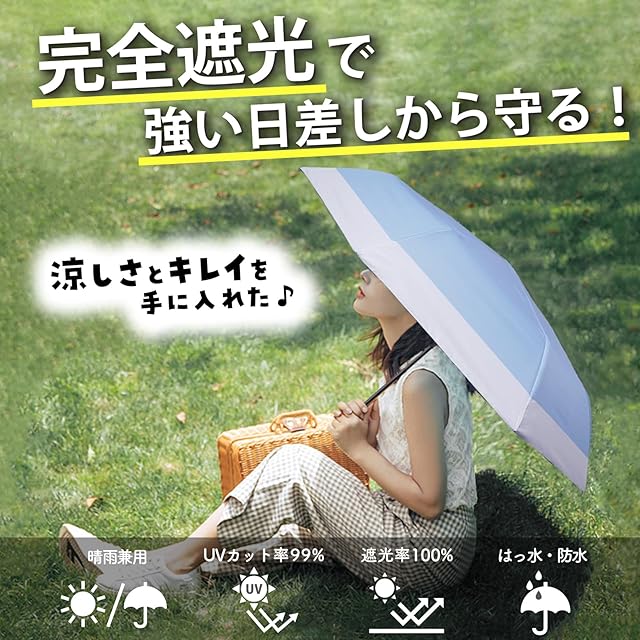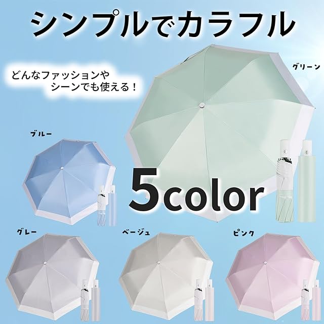 【デザイン】シンプルでカラフルでおしゃれな日傘です。暑さが厳しい時も気分を明るくしてくれるカラーバリエーションを採用!色はブルー、グリーン、グレー、ベージュ、ピンクの5色。どんなファッションやシーンでも合わせやすく使いやすい折り畳み日傘です。