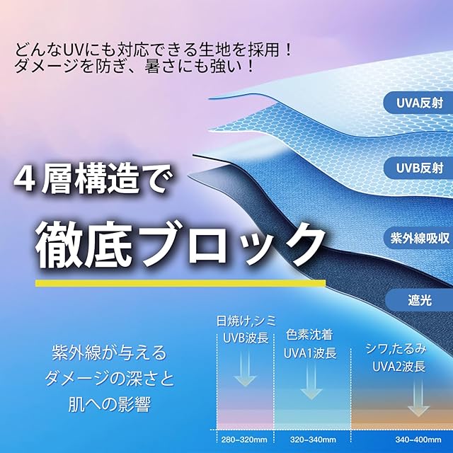 【どんなUVにも強い】あらゆる紫外線も徹底ブロックする4層構造の生地を採用。強い日差しを徹底的にブロック!UVA(肌の奥まで届く紫外線A波)、UVB(肌を赤くする紫外線B波)、直射日光、日差しから肌を守ります。日焼け防止、熱中症対策、美肌づくりに効果的です。UVカット率99.9%、遮光率100%、UPF50+