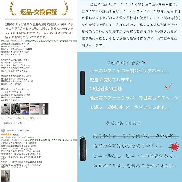 日傘の効能です。生地の裏面にUVコーティングとブラックこーティンを実施しており。すごく日差しが遮断でき、カバーは99.9%以上UVカット率、100%遮光率、遮熱なので暑い日の外出はお熱症の心配がありませんでご安心にお出掛けます。