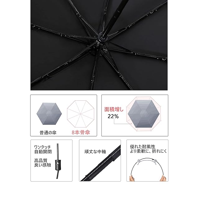☂【自動開閉&強風対策】軽く押すと自動開閉できます。車を降りたり、子供を抱いたり、荷物を持っている時、折り畳み傘は最適です。空気力学に基づいて風を受け流す構造で設計されているので、強い風でびっくり返っても元に戻ります。二人で荷物を持って傘に入っても余裕があるほどの大きさですので。梅雨はもちろん、豪雨、強風にも安心できまる8本骨おりたたみ傘です。