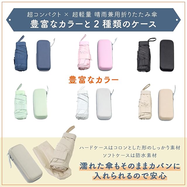 ✅【実用的な2種類のケース付き】コロンとした形が可愛いハードケースと防水ソフトケースの2種類のケースが付属。濡れた傘もそのままカバンに入れて持ち歩けます。ハードケースはペンケースのようなしっかりさで他の用途にも使用可能。