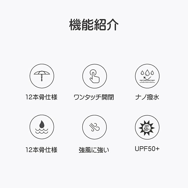 【優れた性能】 晴れた日にはUPF50+ UVカット率は99%、遮光率は100%で活躍し、雨が降っても撥水加工はもちろん、強い風にも強い12本骨を採用しています。