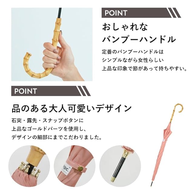 こだわりのデザイン ▼バンブー手元はシンプルながらも女性らしい上品な印象で節があって持ちやすい。 ▼石突・露先・スナップボタンには上品なゴールドパーツを使用。 ▼開くと直径97cmと荷物を持っていても十分に雨をしのげる大きさでありながら、閉じると細身でスタイリッシュなデザイン。
