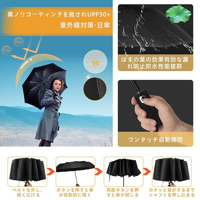 【ワンタッチ自動開閉】便利なワンタッチデザインで、スイッチを押すだけで瞬時に傘を開閉できます。乗り降りや片手が空いている時に非常に便利です。スイッチは何万回もの開閉テストを経ており、耐久性に優れています。注意:24本骨の大きい折りたたみ傘の重さは約460グラムです。もし重さが気になる場合は、ご理解のほどよろしくお願いいたします。
