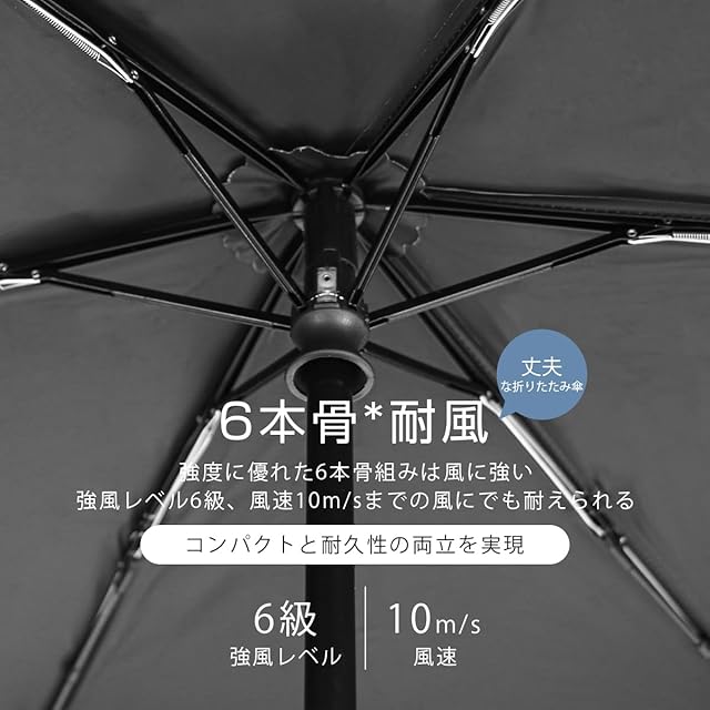 【耐風6骨傘】撥水加工を施しておりますので、日傘としてだけではなく雨傘としてもご利用いただけます。また、耐風骨を使用した特殊構造により強風にあおられた際に反り返ることで、風の力を受け流します。折りたためば元通り使用できます。