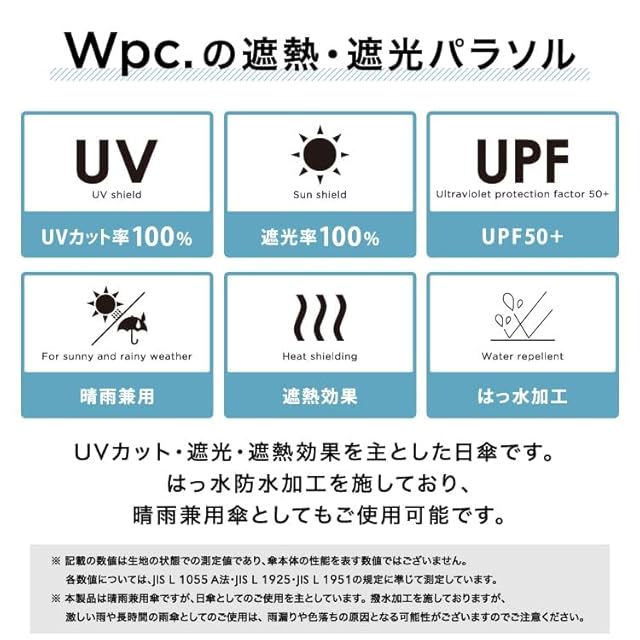 【遮光率・UVカット率100%、UPF50+ 完全遮光日傘】 全カラー遮光率・UVカット率ともに100%、UPF50+を実現し、日差しからお肌を守ります。 日焼けを防ぐために必要なUVカットの性能を兼ね揃えた、紫外線対策にはピッタリの日傘です。 涼しく過ごすための遮熱性も優れているため、暑い夏の熱中症対策にも。 ※記載の遮光率・紫外線遮蔽(UVカット)率・UPF値は生地の状態での測定値です。 傘本体の性能を示す数値ではございません。<br> また、生地に施された刺繍・縫製などUV加工生地以外の部分もその限りではありません。
