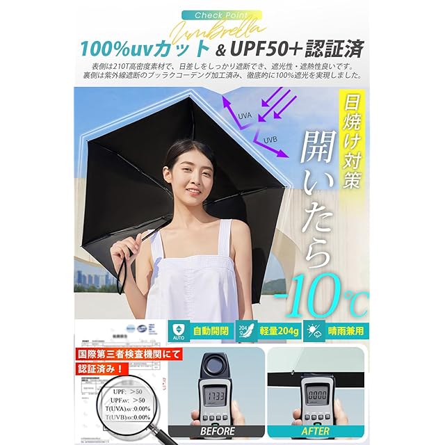 【100%uvカット率&UPF50+認証済み】 折りたたみ傘は国際的な第三者検査機関によってUVカット率100%の遮光性を認定されました。折りたたみ傘の表側は210T高密度素材で、日差しをしっかり遮断でき、遮光性・遮熱性良いです。一方、裏側は紫外線遮断のブッラクコーティング加工済み、徹底的に100%遮光を実現しました。しっかりと紫外線カットして日焼けを防止し、✅完全遮光を誇る折り畳み傘です。