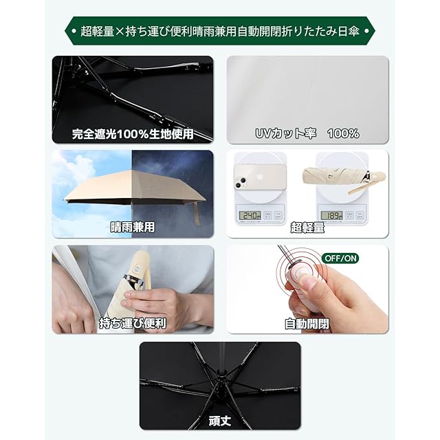 konciwa 超軽量 199g UVカット率 100 遮光率100% 日傘 折りたたみ ワンタッチ自動開閉 完全遮光 晴雨兼用 レディース コンパクト 折り畳み日傘 紫外線遮断 耐風撥水 携帯便利 メンズ 母の日 父の日 | ascend