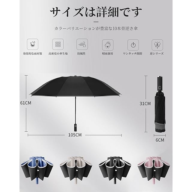 【逆折り式デザイン】この折りたたみ傘は、逆に折りたたむことで車内や地面を濡らさず、外から室内に入る際に便利です。